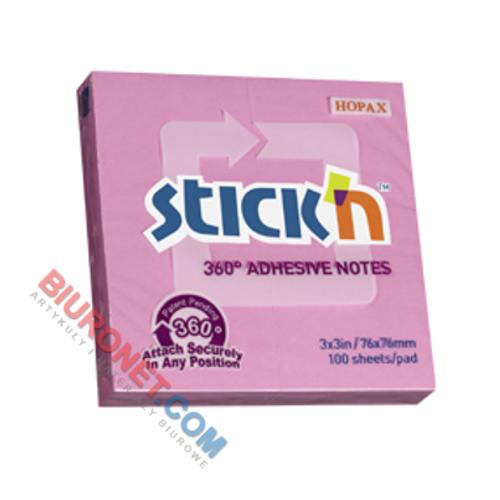 Karteczki samoprzylepne Stick'n z klejem 360 stopni 76x76 mm, bloczek 100 kartek różowy