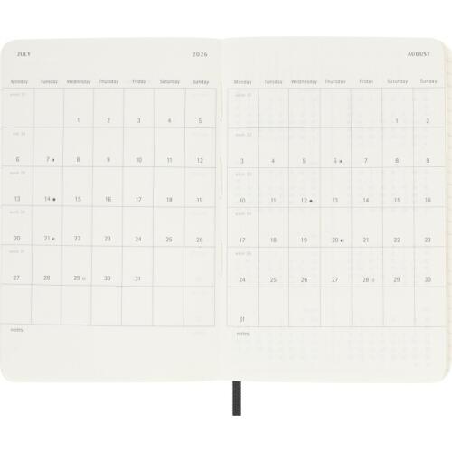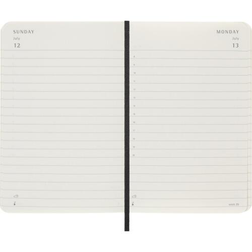 Kalendarz książkowy Moleskine na rok 2026 w kompaktowym formacie to idealne narzędzie dla tych, którzy potrzebują mieć swoje plany zawsze pod ręką. Jego miękka oprawa w klasycznym, czarnym kolorze jest zarówno stylowa, jak i elastyczna, co ułatwia przenoszenie. Datowany od stycznia do grudnia, z układem "dzień na stronie", umożliwia szczegółowe planowanie każdego dnia, dając wystarczającą przestrzeń na wszystkie notatki i spotkania.