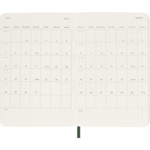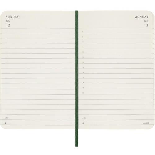 Kalendarz książkowy Moleskine na rok 2026 w kompaktowym formacie to idealne narzędzie dla tych, którzy potrzebują mieć swoje plany zawsze pod ręką. Jego miękka oprawa w klasycznym, zielonym kolorze jest zarówno stylowa, jak i elastyczna, co ułatwia przenoszenie. Datowany od stycznia do grudnia, z układem "dzień na stronie", umożliwia szczegółowe planowanie każdego dnia, dając wystarczającą przestrzeń na wszystkie notatki i spotkania.