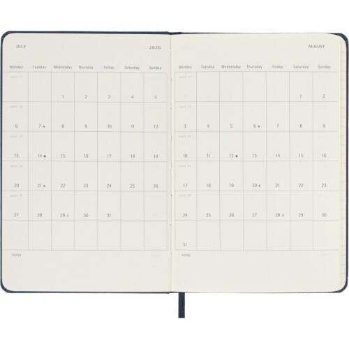 Kalendarz książkowy Moleskine na rok 2026 w kompaktowym formacie to idealne narzędzie dla tych, którzy potrzebują mieć swoje plany zawsze pod ręką. Jego twarda oprawa w klasycznym, niebieskim kolorze zapewnia skuteczną ochronę notatek. Datowany od stycznia do grudnia, z układem "dzień na stronie", umożliwia szczegółowe planowanie każdego dnia, dając wystarczającą przestrzeń na wszystkie notatki i spotkania.