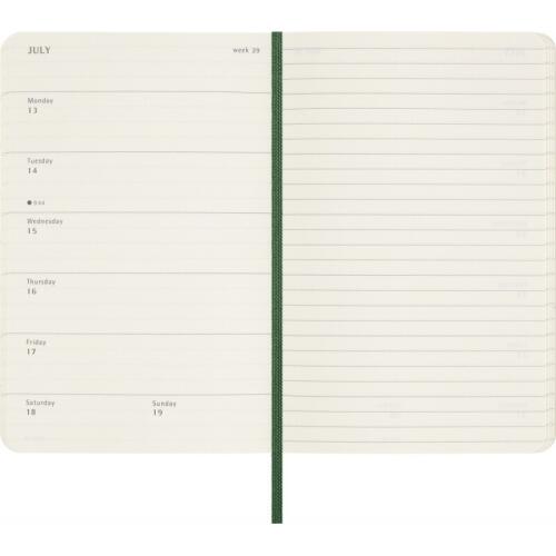 Oprawa miękka w klasycznym, zielonym kolorze jest przyjemna w dotyku i łatwa do przenoszenia, a zaokrąglone rogi i elastyczna gumka do zamykania dodają mu elegancji. Kalendarz wykonany jest z bezkwasowego papieru w kolorze kości słoniowej o gramaturze 70 g/m², pochodzącego z dobrze zarządzanych lasów z certyfikatem FSC, co podkreśla dbałość o środowisko. Wstążka do zakładek ułatwia szybkie odnajdywanie bieżącego tygodnia, a wewnętrzna, rozszerzalna kieszeń pozwala na przechowywanie luźnych kartek.