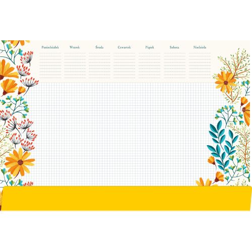 Posiada także tygodniowy plan zajęć, który pomoże Ci zaplanować spotkania, terminy i cele. Na dole znajduje się listwa zabezpieczająca podkład przed zniszczeniami i przesuwaniem się. Podkład jest wykonany z wysokiej jakości papieru o gramaturze 70g/m2, który jest przyjemny w dotyku. Jego wymiary to 35x50 cm, co pasuje do większości biurek.