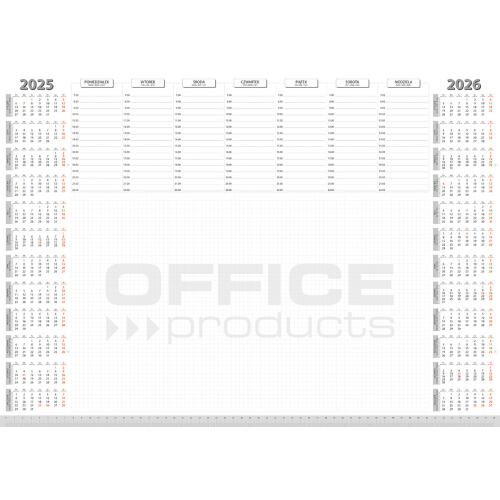 Podkładka na biurko OFFICE PRODUCTS to nie tylko praktyczna ochrona Twojego biurka, ale także funkcjonalny planer na dwa lata. Oryginalny projekt został stworzony zgodnie z zasadami organizacji czasu pracy, umożliwiając efektywne planowanie na 2024 i 2025 rok. Po lewej stronie znajduje się kalendarz na 2025 rok, po prawej - na 2026 rok. Dni wolne są wyróżnione na czerwono, a górna część obejmuje rozkład tygodnia oraz godziny od 7:00 do 20:00. Pod kalendarzem tygodniowym znajduje się powierzchnia w kratkę przeznaczona na notatki.