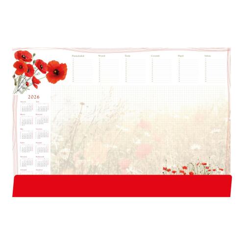 Podkładka na biurko Michalczyk i Prokop T-2-B3 to stylowe i funkcjonalne narzędzie do organizacji pracy na rok 2026. Jej duży format B3 (490 x 335 mm) zapewnia komfortową przestrzeń do pisania i planowania, chroniąc jednocześnie blat biurka. Estetyczny motyw maków w pełnym kolorze dodaje elegancji i ożywia każde stanowisko pracy, łącząc w sobie użyteczność z unikalnym designem.