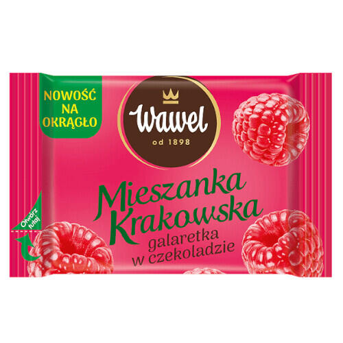 Mieszanka Krakowska na okrągło to kultowa słodycz w nowej odsłonie, łącząca intensywny, malinowy smak galaretki z aromatyczną otoczką deserowej czekolady Wawel. Każdy kęs dostarcza harmonijnego połączenia słodyczy i lekkiej goryczki, co czyni ją idealną, elegancką przekąską na co dzień i od święta w biurze.