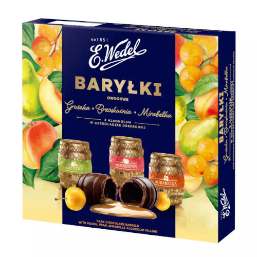 Baryłki owocowe E. Wedel to kwintesencja słodkiego luksusu, idealna do uświetnienia każdej biurowej okazji czy jako wyrafinowany poczęstunek dla gości. Harmonijne połączenie klasycznej czekolady deserowej z intensywnie owocowym nadzieniem z nutą alkoholu, gwarantuje niezapomniane doznania smakowe, godne najlepszej polskiej tradycji cukierniczej.