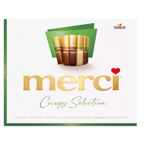 Dzięki swojej różnorodności i wysokiej jakości, merci Crispy Selection jest idealnym wyborem jako poczęstunek dla kluczowych klientów lub uprzejmy gest podziękowania dla współpracowników. Eleganckie opakowanie podkreśla prestiż i dbałość o detale. Produkt może zawierać także orzeszki ziemne i inne orzechy.
