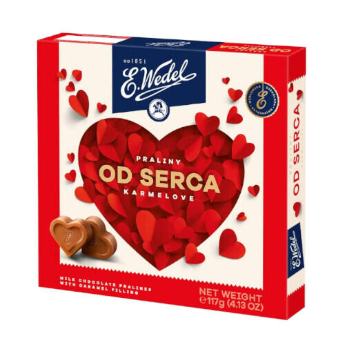 Praliny Od Serca Karmelowe to wykwintna bombonierka 117 g z nadziewanymi czekoladkami mlecznymi, które kuszą niepowtarzalną, oryginalną wedlowską czekoladą. Każda pralina ma kształt serca i zawiera przepyszne, dwuwarstwowe nadzienie, które łączy aksamitną słodycz z chrupiącymi płatkami karmelowymi. To doskonały wybór na elegancki, słodki upominek w biurowym otoczeniu.