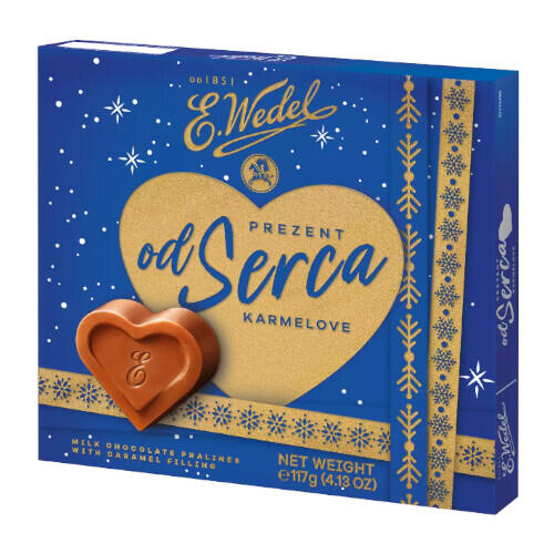 Praliny Od Serca to elegancka bombonierka 117 g z nadziewanymi czekoladkami mlecznymi, które kuszą smakiem oryginalnej wedlowskiej czekolady. Każda pralina ma uroczy kształt serca i jest przepełniona unikalną przyjemnością smaku, stanowiąc doskonały, słodki upominek na święta lub inne wyjątkowe okazje.